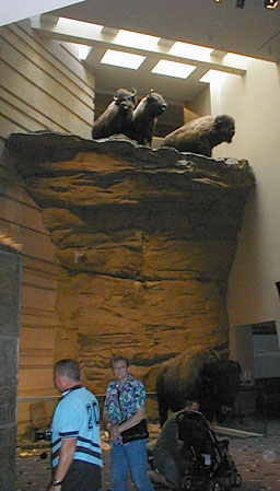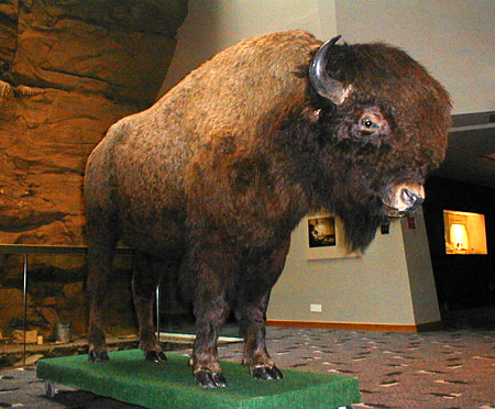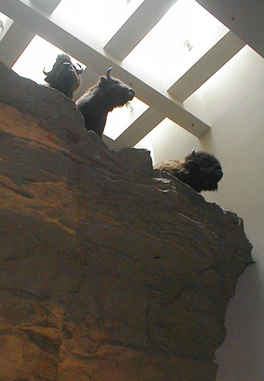 A closer shot of the stuffed buffalo at the top of the mock cliff.